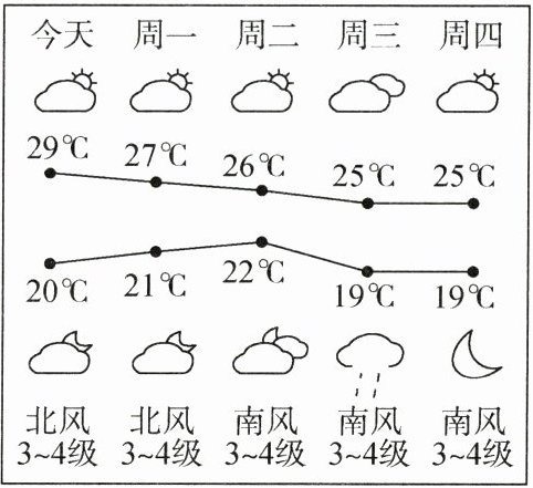 B.周一多云,最低气温21℃,北风3~4级