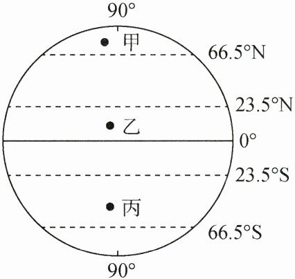 5.B 解析:读图可知,甲地纬度高于66.5°N,乙地纬度低于23.5°N,丙地纬度在23.5°S~66.5°S之间。纬度越低,年平均气温越高。