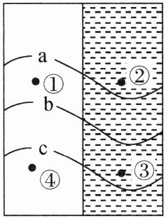 3. 读等值线分布图,图中数值a>b>c,下列叙述正确的是 (