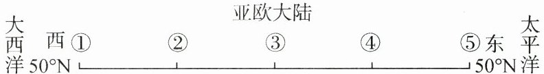 13. 下面是亚欧大陆沿 $ 50^{\circ}N $ 自大西洋沿岸到太平洋沿岸示意图,①②③④⑤分别表示 5 个地点。下列有关这 5 个地点降水量变化规律的说法,正确的是(