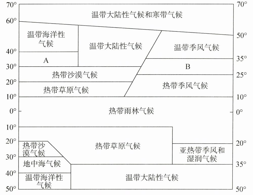 (3)图中 B 为亚热带季风和湿润气候,A 为