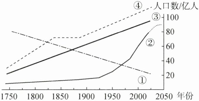 4. 读世界人口增长图,图中哪一条线能表示世界人口增长特点(