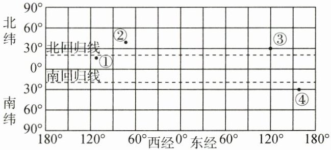 1.C 解析:图中城市①的经纬度约为20°N,110°W;城市②的经纬度约为40°N,70°W;城市④的经纬度约为30°S,160°E。