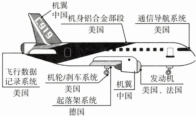 C919是我国拥有完全自主知识产权的国产大飞机。读C919部分零部件来源图,完成9~10题。