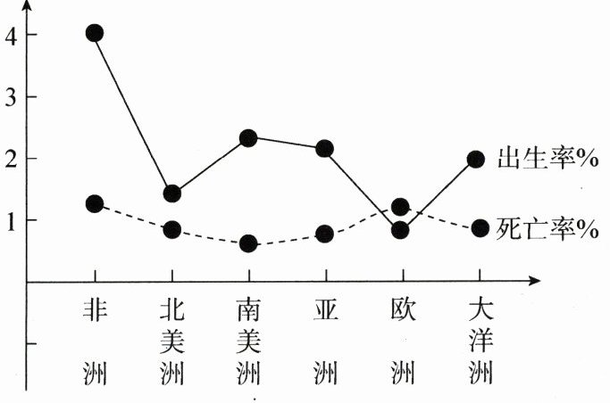 读部分大洲人口出生率和死亡率示意图,完成 1~2 题。