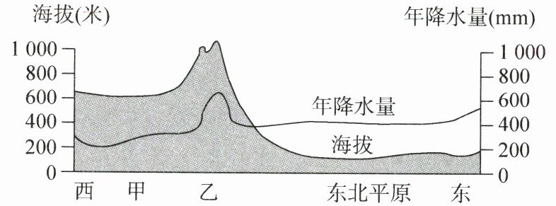 下图为我国某区域东西向地形剖面及年降水量分布图。读图,完成11~12题。