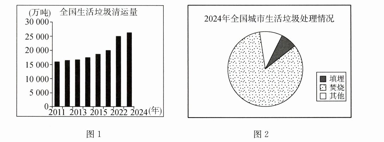 材料二 阅读“全国生活垃圾清运量图”(图1)和“2024年全国城市生活垃圾处理情况图”(图2)。