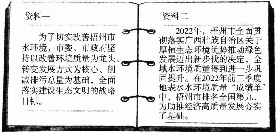 材料二 梧州市在治理水环境方面取得了一定成效,但是也存在某些问题。例如:人们对保护水环境的重要性认识不够;部分企业无视法律法规,偷排污水。