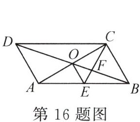 16. 如图,$□ ABCD$的对角线$AC$,$BD$相交于点$O$,$CE$平分$\angle BCD$交$AB$于点$E$,交$BD$于点$F$,且$\angle ABC = 60°$,$AB = 2BC$,连接$OE$.有下列结论: