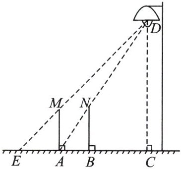 17. 一天晚上,李明和张龙利用灯光下的影子长来测量一路灯$D$的高度.如图,当李明走到点$A$处时,张龙测得李明直立时身高$AM$与其影子长$AE$正好相等;接着李明沿$AC$方向继续向前走,走到点$B$处时,李明直立时身高$BN$的影子恰好是线段$AB$,测得$AB = 1.25 m$.已知李明直立时的身高为$1.75 m$,求路灯的高$CD$(结果精确到$0.1 m$).
