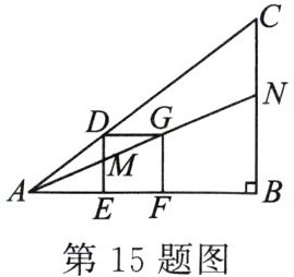 15. 如图,$\triangle ABC$中有一正方形$DEFG$,其中点$D$在$AC$上,点$E$,$F$在$AB$上,直线$AG$分别交$DE$,$BC$于点$M$,$N$.若$\angle B = 90°$,$AB = 4$,$BC = 3$,$EF = 1$,则$BN$的长度为