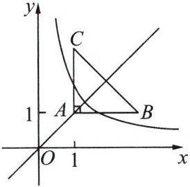 14.如图,等腰直角三角形$ABC$位于第一象限,$AB = AC = 2$,直角顶点$A$在直线$y = x$上,其中$A$点的横坐标为$1$,且两条直角边$AB$,$AC$分别平行于$x$轴、$y$轴,若双曲线$y = \frac{k}{x}$($k\neq0$)与$\triangle ABC$有交点,则$k$的取值范围是(