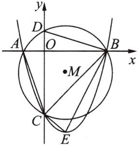 12.如图,已知抛物线$y = ax^{2} + bx - 3$与$x$轴交于$A$,$B$两点,与$y$轴交于点$C$,经过$A$,$B$,$C$三点的圆的圆心$M(1,m)$恰好在此抛物线的对称轴上,$\odot M$的半径为$\sqrt{5}$.设$\odot M$与$y$轴交于点$D$,抛物线的顶点为$E$.
