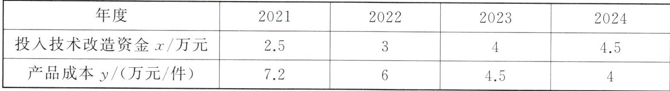 例 某公司从 2021 年开始加大投入技术改造资金,经技术改造后,其产品的成本不断降低,相关数据如下表: