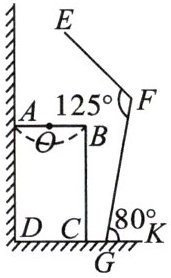 8.下图为小强洗漱时的侧面示意图,洗漱台(矩形$ABCD$)靠墙摆放,高$AD = 80 cm$,宽$AB = 48 cm$.小强身高$166 cm$,下半身$FG = 100 cm$,洗漱时下半身与地面成$80^{\circ}(\angle FGK = 80^{\circ})$,身体前倾成$125^{\circ}(\angle EFG = 125^{\circ})$,脚与洗漱台距离$GC = 15 cm$(点$D$,$C$,$G$,$K$在同一直线上).