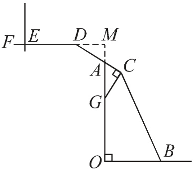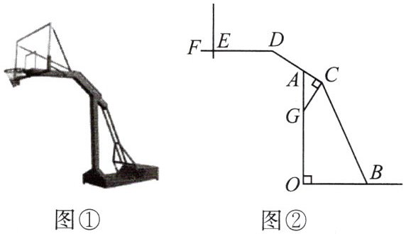 9.图①是某款篮球架,图②是其示意图,立柱$OA$垂直于地面$OB$,支架$CD$与$OA$交于点$A$,支架$CG\bot CD$交$OA$于点$G$,支架$DE$平行于地面$OB$,篮筐$EF$与支架$DE$在同一直线上,$OA = 2.5 m$,$AD = 0.8 m$,$\angle AGC = 32^{\circ}$.