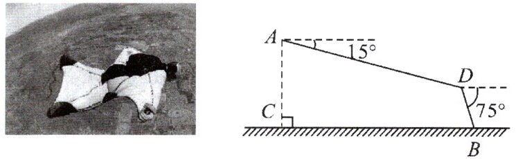 俯角为$15°$的方向,直线飞行1 600 m到达$D$点,然后该翼装飞行运动员打开降