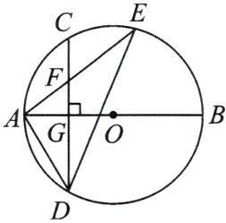16.如图,$AB$是$\odot O$的直径,弦$CD\perp AB$于点$G$,点$F$是$CD$上一点,且$\frac{CF}{FD}=\frac{1}{3}$,连接$AF$并延长交$\odot O$于点$E$,连接$AD,DE$.若$CF=2$,$AF=3$,有下列结论:①$\triangle ADF\backsim\triangle AED$;②$FG=2$;③$\tan E=\frac{\sqrt{5}}{2}$;④$S_{\triangle DEF}=4\sqrt{5}$.其中正确的是