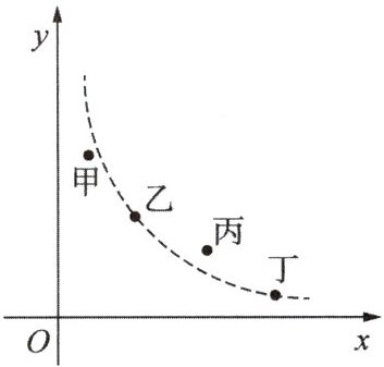 5. 某市举行中学生科普知识竞赛.如图,用四个点分别描述甲、乙、丙、丁四所学校竞赛成绩的优秀率$y$(该校竞赛成绩优秀的人数与该校参加竞赛人数的比值)与该校参加竞赛人数$x$的情况,其中描述乙、丁两所学校情况的点恰好在同一个反比例函数的图象上,则这四所学校在这次科普知识竞赛中成绩优秀人数最多的是(