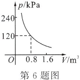 6. 充有一定质量气体的气球,根据物理学知识可知,当温度不变时,气球内的气体压强$p$(单位:$ kPa$)与气体的体积$V$(单位:$ m^3$)之间满足反比例函数关系,其图象如图所示.当气球内的气体压强大于$140\ kPa$时,气球将爆炸.为了安全起见,气球的体积应(