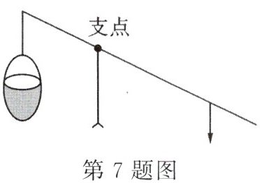 7. 如图,一杠杆装置的一端吊起一桶水,水桶对杆的拉力的作用点到支点的距离固定不变.甲、乙、丙、丁四位同学分别在杆的另一端施加竖直向下的压力$F_ 甲$,$F_ 乙$,$F_ 丙$,$F_ 丁$,将相同质量的水桶吊起同样的高度,若$F_ 乙 < F_ 丙 < F_ 甲 < F_ 丁$,则这四位同学对杆的压力的作用点到支点的距离最远的是(