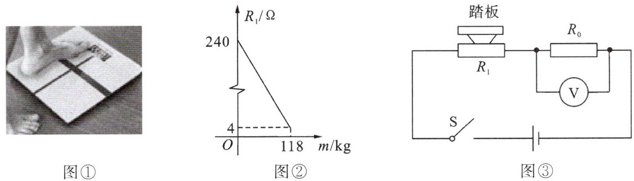 9. 如图①,电子体重秤读数直观又便于携带,为人们带来了方便.某综合实践活动小组设计了简易电子体重秤.他们制作了一个装有踏板(踏板质量忽略不计)的可变电阻$R_1$,$R_1$与踏板上人的质量$m$之间的函数关系式为$R_1 = km + b$(其中$k$,$b$为常数,$0 \leq m \leq 118$),其图象如图②所示.图③的电路图中,电源电压恒为$8\ V$,定值电阻$R_0$的阻值为$30\ \Omega$,接通开关,人站上踏板,电压表显示的读数为$U_0$,该读数可以换算出人的质量$m$.