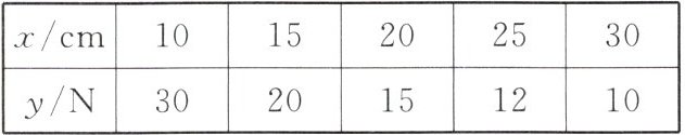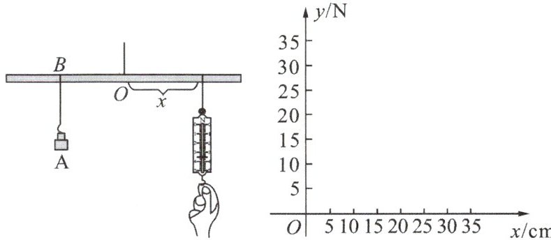 11. 如图,小丹设计了一个探究杠杆平衡条件的实验:在一根匀质的木杆中点$O$左侧固定位置$B$处悬挂重物$ A$,在中点$O$右侧用一个弹簧秤向下拉,改变弹簧秤与点$O$的距离$x$(单位:$ cm$),观察弹簧秤的示数$y$(单位:$ N$)的变化情况.