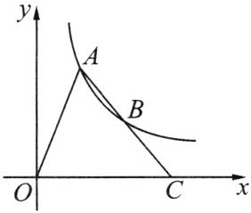 9.如图,点$A,B$在反比例函数$y = \frac{k}{x}(x > 0)$的图象上,延长$AB$交$x$轴于点$C$,若$\bigtriangleup AOC$的面积是$12$,且点$B$是$AC$的中点,则$k =$