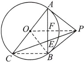 (2) 连接 $ BC $,设 $ OP $ 交 $ AB $ 于点 $ F $。
