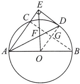 解析:(1)连接$OD$,只要得出$OD \perp DE$即可.(2)属于圆外直角的问题,可以通过切点作半径构造矩形.连接$OD$,$BC$,相交于点$G$,如图,再根据已知条件,可求得$\frac{AF}{DF} = \frac{AE}{OD} = \frac{8}{5}$.