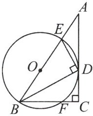 3. 如图,在$ Rt \triangle ABC$中,$\angle ACB = 90^{\circ}$,$\angle ABC$的平分线$BD$交$AC$于点$D$,$DE \perp DB$交$AB$于点$E$,$\triangle BDE$的外接圆$\odot O$交$BC$于点$F$.若$\odot O$的半径为$5\ cm$,$BC = 8\ cm$,求$AC$的长.