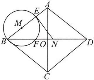 9. 如图,在菱形$ABCD$中,对角线$AC$,$BD$相交于点$O$,$AC = 12\ cm$,$BD = 16\ cm$.动点$N$从点$D$出发,沿线段$DB$以$2\ cm/s$的速度向点$B$运动;同时动点$M$从点$B$出发,沿线段$BA$以$1\ cm/s$的速度向点$A$运动.当其中一个动点停止运动时,另一个动点也随之停止运动.设运动时间为$t$(单位:$ s$)($t > 0$),以点$M$为圆心,$MB$长为半径的$\odot M$与射线$BA$、线段$BD$分别交于点$E$,$F$,连接$EN$.