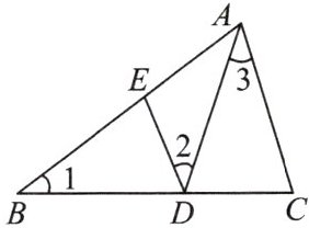 13. 如图,在$\bigtriangleup ABC$中,点$D$在$BC$上,点$E$在$AB$上,且$\angle 1 = \angle 2 = \angle 3$,如果$\bigtriangleup ABC$,$\bigtriangleup EBD$,$\bigtriangleup ADC$的周长依次为$m_1$,$m_2$,$m_3$,$BD = 6$,$DC = 2$,求$\frac{m_2 + m_3}{m_1}$的值.