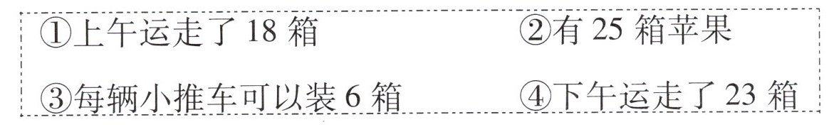 |③每辆小推车可以装6箱|④下午运走了23箱|