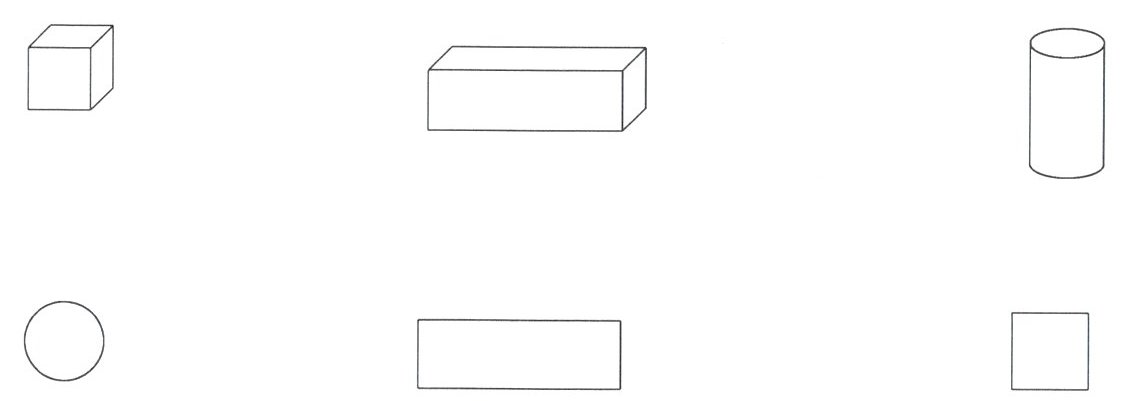 二、从正方体、长方体和圆柱的上面看,看到的分别是什么图形?用线连一连。