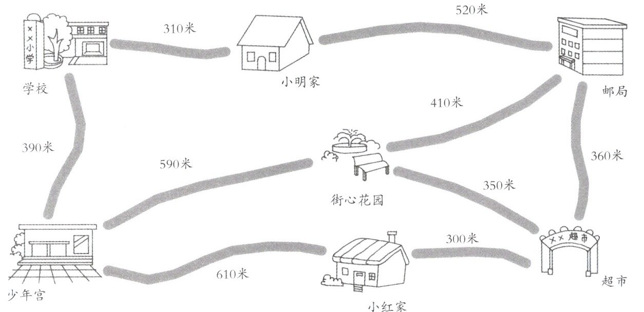 )的距离刚好是 1 千米。请用彩笔标出来。2. 想一想,填一填。