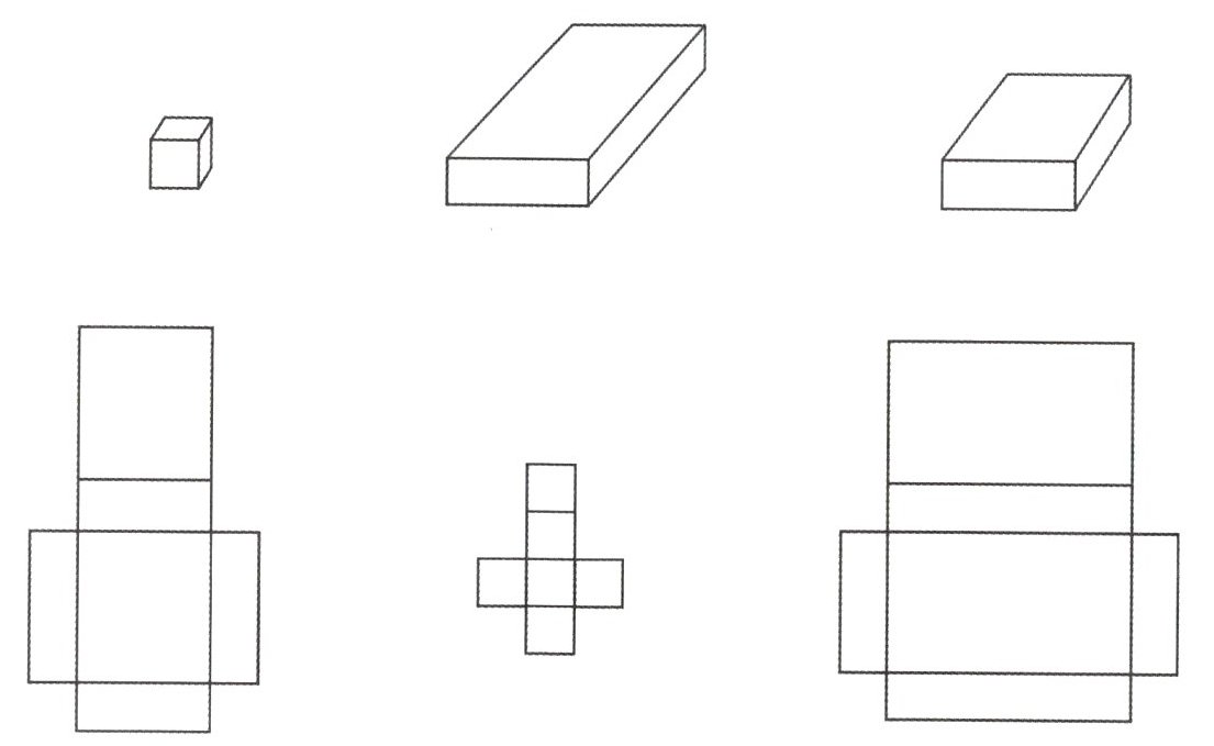 一、下图中的盒子剪开铺平后,对应的展开图分别是哪一个?请用线连起来。