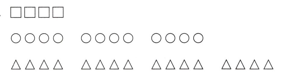 1. 第二行画△,△的个数是□的4倍。第二行有(