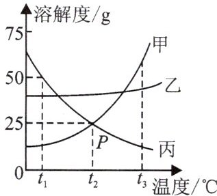 (3)将$t_3° C$时等质量甲、乙、丙三种物质的饱和溶液降温到$t_2° C$,所得溶液中溶剂质量最大的是