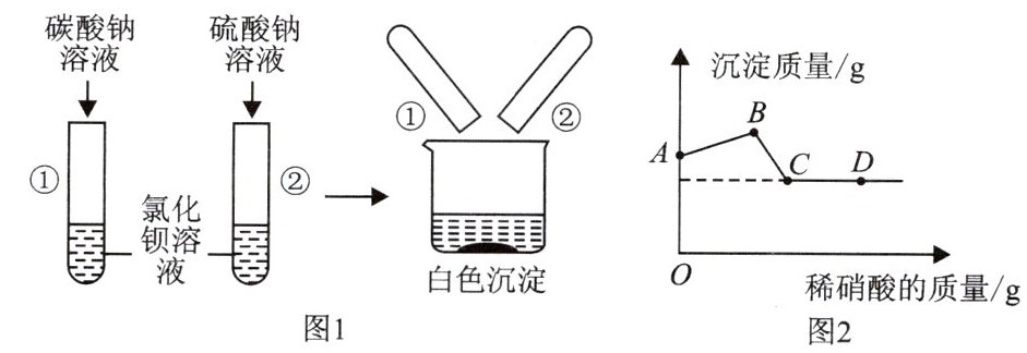 10. 如图 1 所示,小瑾将反应后试管中的物质全部倒入烧杯时,发现烧杯内白色沉淀明显增多。为了探究烧杯内物质的成分,她立即向其中逐滴加入稀硝酸,并不断搅拌,烧杯内沉淀的质量随加入稀硝酸的质量变化如图 2 所示。