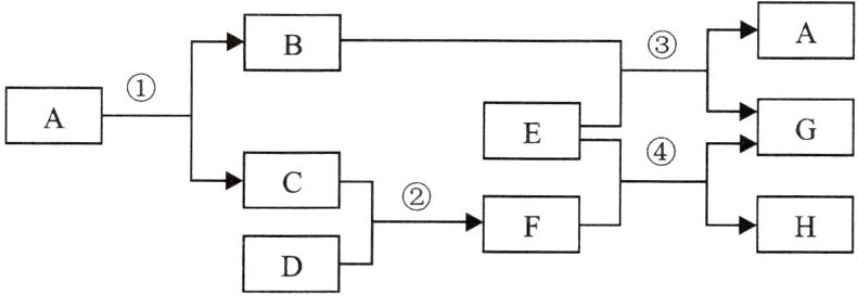 9. 为减少炼铁过程中生成$CO_2$的质量,某小组设计了如图所示的炼铁新方案(反应条件已略去)。A~H 是初中化学常见物质,其中 A 是常用的溶剂,G 是目前世界年产量最高的金属;反应①中用到的电为“绿电”,获得“绿电”的过程中不排放$CO_2$。请回答下列问题: