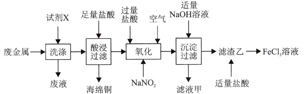 7. 某化工厂以废金属(主要成分为 $ Fe$ 和 $ Cu$,表面有少量油污)为原料回收海绵铜,并制备氯化铁的工艺流程如图所示。