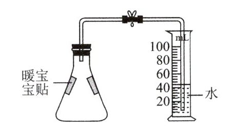 6. 兴趣小组同学用下图所示装置利用暖宝宝贴(主要成分为铁粉、氯化钠、水等)测定空气中氧气含量。一段时间后打开止水夹,水倒吸入锥形瓶,测得实验数据如下表。下列说法不正确的是(
