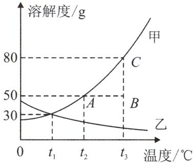 (填序号)。① B 点对应的甲溶液降温至 $t_2 ° C$,溶液恰好饱和