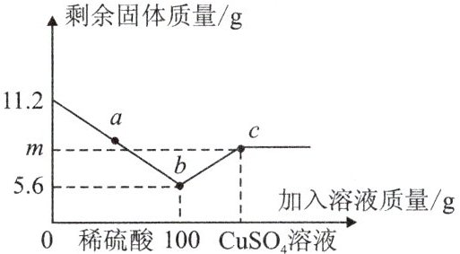 7.向$11.2g$铁粉中先加入$100g$稀硫酸,再加入一定量的硫酸铜溶液,反应过程中固体的质量与加入物质的质量关系如图所示,下列说法错误的是(