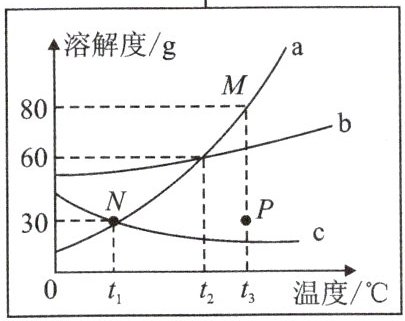 2.温度由$t_{3}$降至$t_{1}$时,a的饱和溶液会