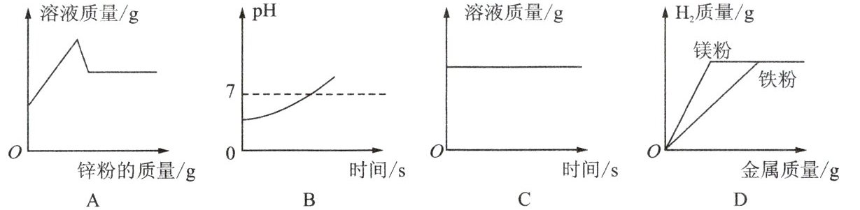 D.图D是向相同质量、相同质量分数的稀盐酸中分别逐渐加入镁粉和铁粉