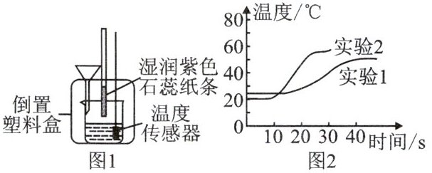 8. 利用图1装置(2组)探究浓硫酸稀释时浓硫酸和水的注入顺序对实验的影响,沿漏斗缓慢加入等量液体后,观察到实验2中的湿润紫色石蕊纸条比实验1中的有更多红色斑点,分别测得两个实验中的温度变化如图2。下列分析不合理的是(