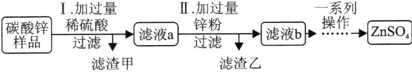 9. 菱锌矿是工业上制备硫酸锌的原料。菱锌矿的主要成分是$\mathrm{ZnCO_3}$,还含有$\mathrm{SiO_2}$和$\mathrm{Fe_2O_3}$等。如图是用碳酸锌样品(杂质为$\mathrm{SiO_2}$和$\mathrm{Fe_2O_3}$;$\mathrm{SiO_2}$难溶于水,也不与稀硫酸反应)模拟工业制备$\mathrm{ZnSO_4}$的流程,已知:锌能将$\mathrm{Fe^{3+}}$转化为$\mathrm{Fe^{2+}}$,再将$\mathrm{Fe^{2+}}$转化为$\mathrm{Fe}$。下列有关说法中,合理的是(