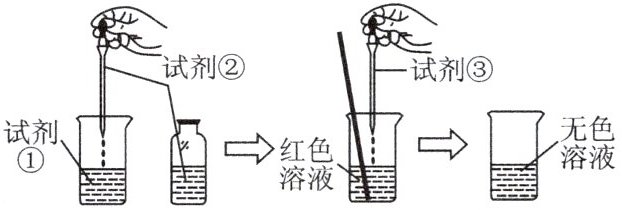 3. 某同学在探究“酸与碱能否发生反应”时,用稀氢氧化钠溶液、稀盐酸和酸碱指示剂进行实验的过程如图。如图所加试剂①②③依次是(